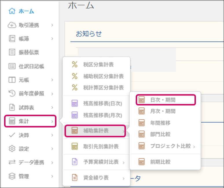 1. メニュー[集計]→[補助集計表]→[日次・期間]をクリックします。
