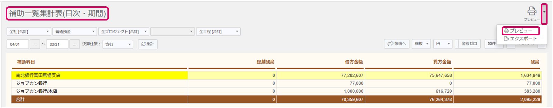 2. [補助一覧集計表(日次・期間)]画面が表示されるので、画面右上の[プレビュー]または横の[▼]→[プレビュー]をクリックします。