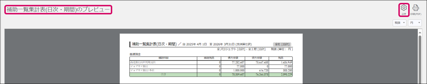 3. [補助一覧集計表(日次・期間)のプレビュー]画面右上の[設定]をクリックします。