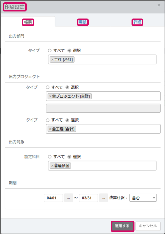 4. [印刷設定]が表示されるので、必要に応じて[帳票]、[用紙]、[詳細]の設定を行い、画面右下の[適用する]をクリックします。