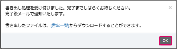 7. 書き出し処理受付のダイアログが表示されるので、画面右下の[OK]をクリックして完了です。