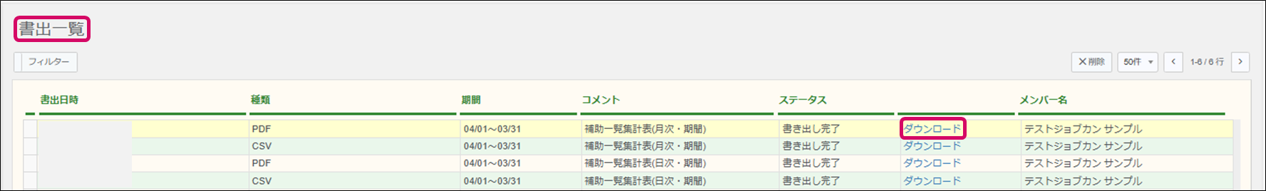 9. メニュー[データ連携]→[書出一覧]をクリックし、該当PDFデータの[ダウンロード]をクリックするとダウンロードが可能です。ダウンロードしたファイルを印刷してください。