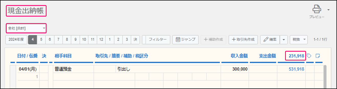9.再びメニューから[帳簿]→[現金出納帳]をクリックし、[現金出納帳]の「全社」に期首残高が反映されていることを確認します。