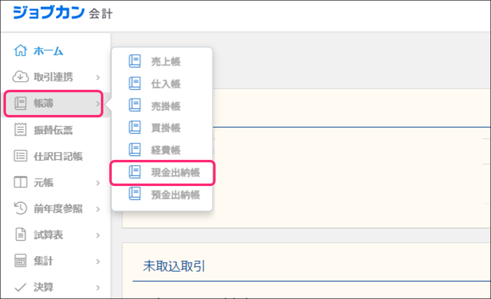 4.次にメニューから[帳簿]→[現金出納帳]をクリックし、[現金出納帳]を表示します。