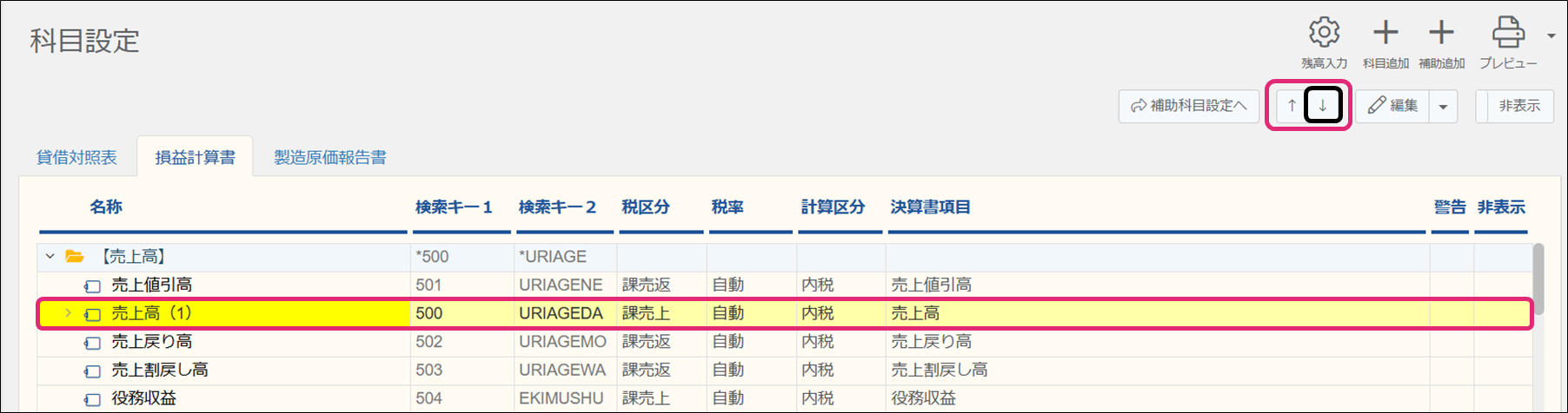 2. [科目設定]画面が表示されます。変更したい科目を選択した状態で右上の[↑・↓]ボタンをクリックします。
