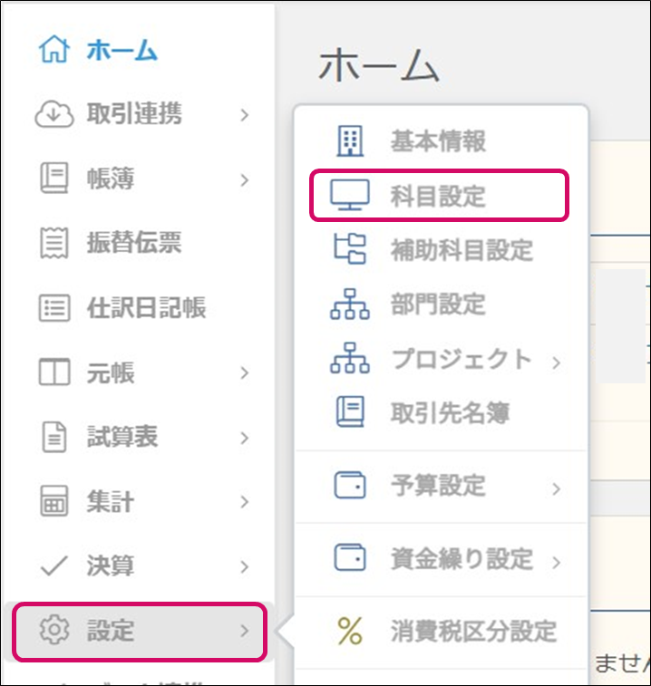 1. メニュー[設定]→[科目設定]をクリックします。