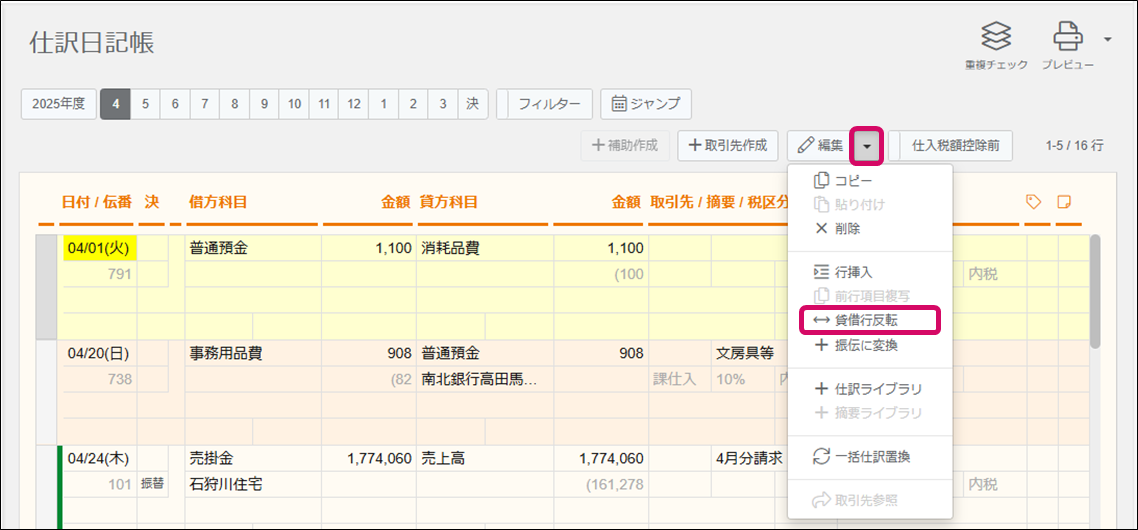 3.行を選択した状態で、右上の[編集]横の[▼]をクリック、最後に[貸借行反転]をクリックします。