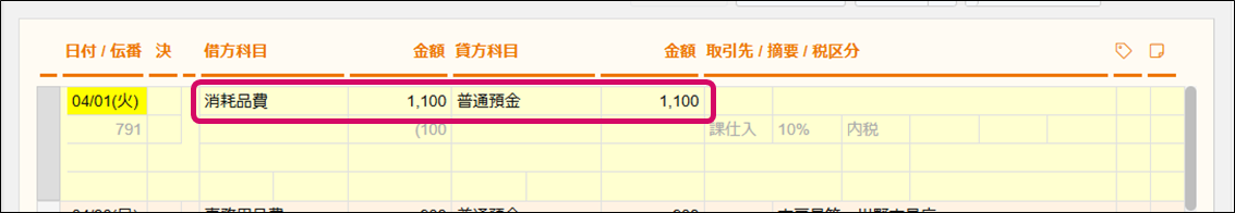 1. メニュー[仕訳日記帳]をクリックし、仕訳日記帳を表示します。