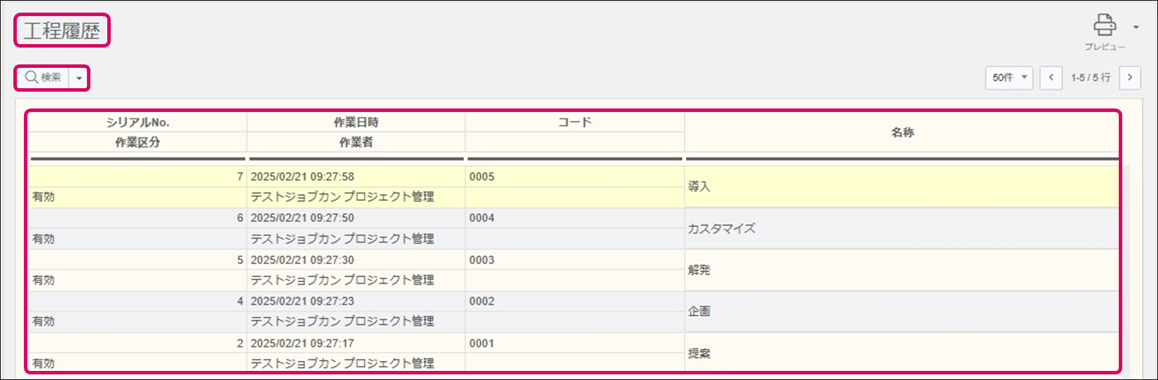 2. [工程履歴]画面が表示されます。必要に応じて[検索]をクリックし、表示する工程履歴の条件を入力します。