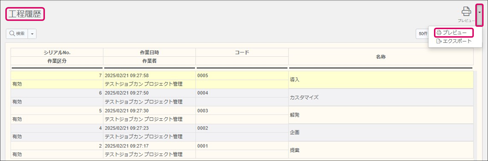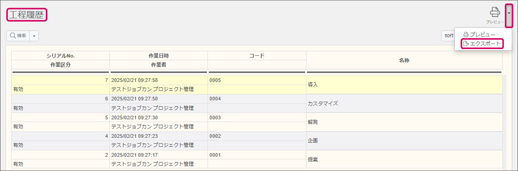 1.[工程履歴]画面で、[プレビュー]横の[▼]→[エクスポート]をクリックします。