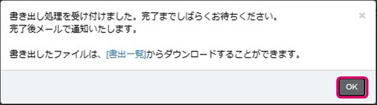 3. 書き出し処理受付のダイアログが表示されるので、画面右下の[OK]をクリックして完了です。