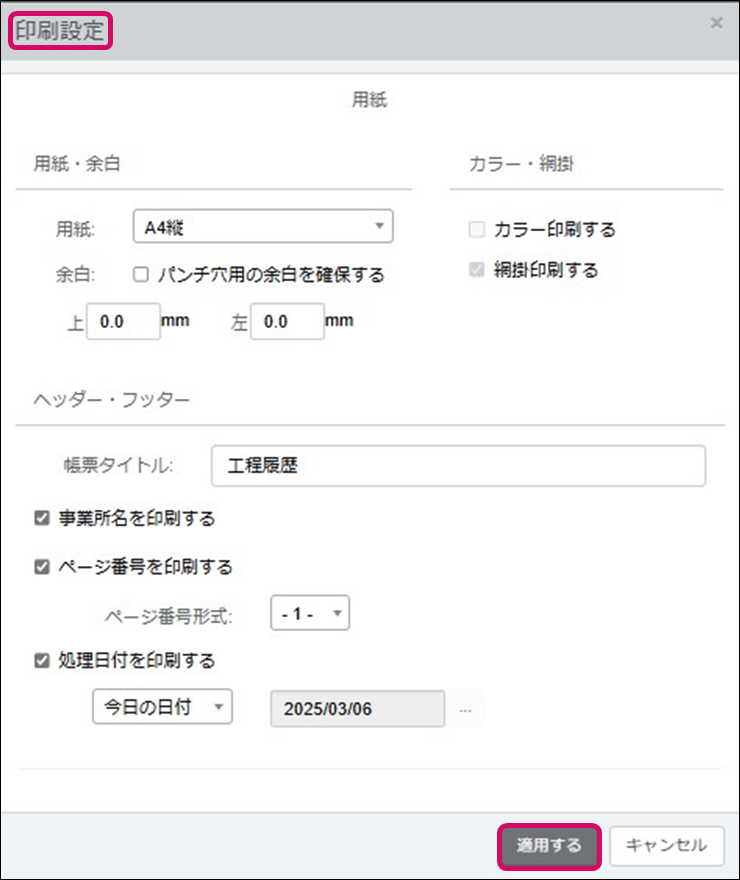3. [印刷設定]が表示されるので、必要に応じて[用紙]の設定を行い、画面右下の[適用する]をクリックします。