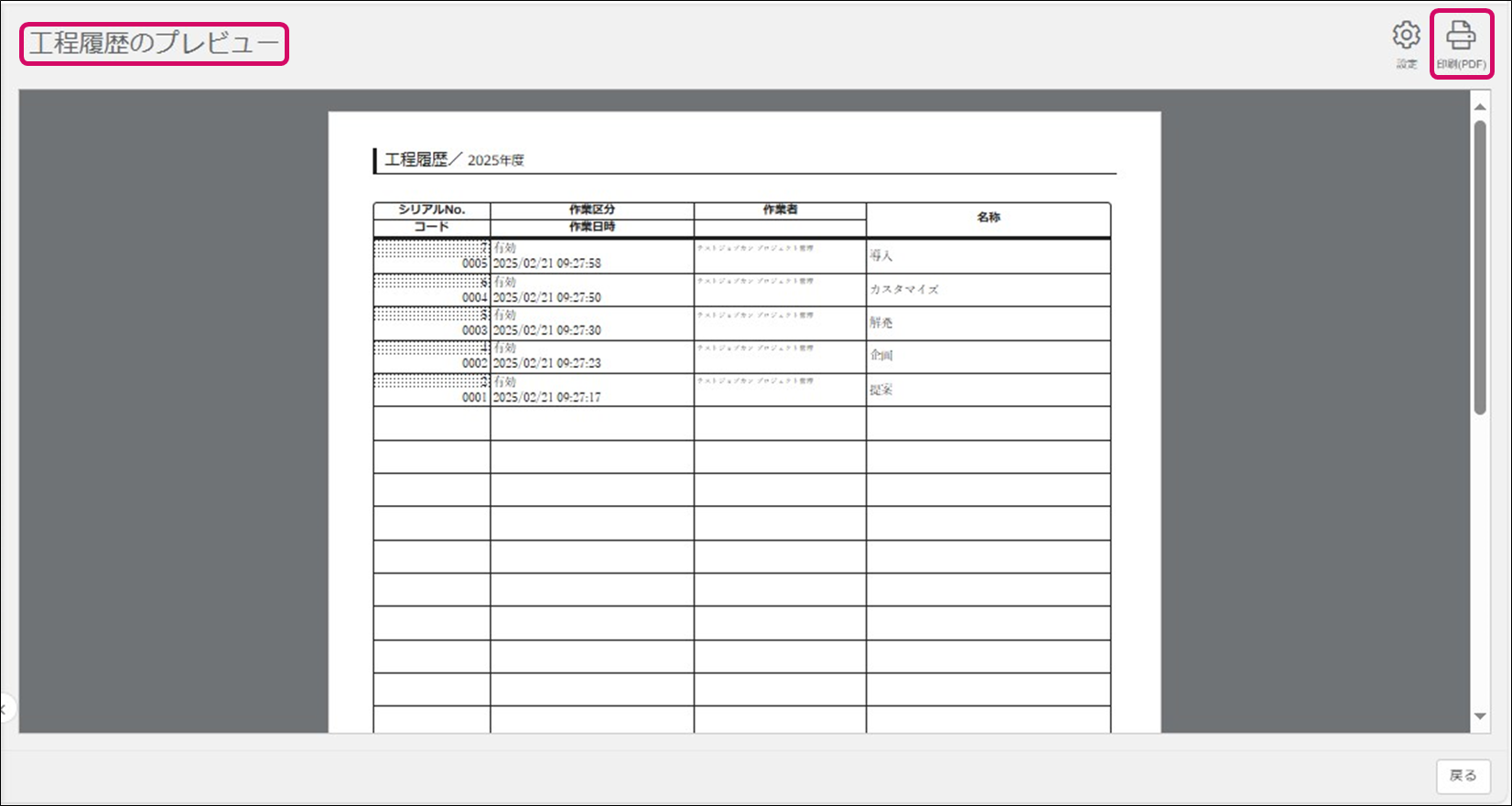 4. [工程履歴のプレビュー]画面右上の[印刷(PDF)]をクリックします。