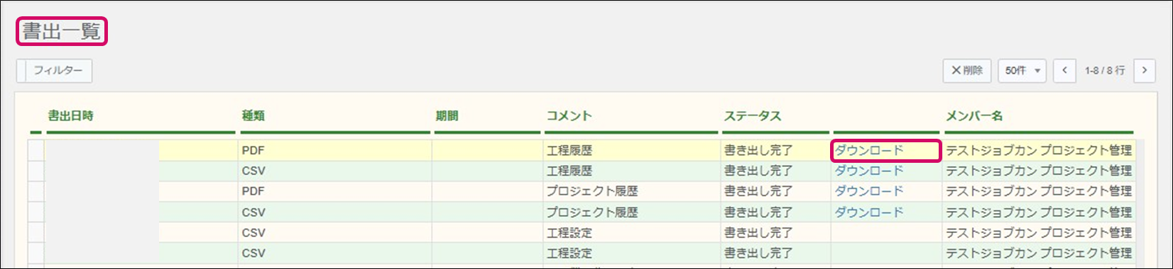 5. [データ連携]→[書出一覧]をクリックし、該当CSVデータの[ダウンロード]をクリックするとダウンロードが可能です。