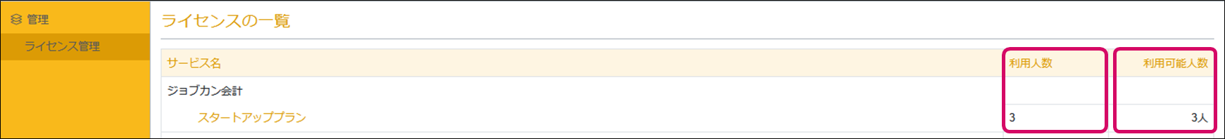 [ライセンス管理へ]をクリックすると、ライセンスの一覧画面で[利用人数]と[利用可能人数]を確認できます。