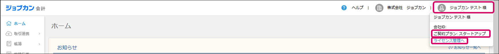 ジョブカン会計にログインした画面右上の、ユーザ名または人型のアイコンをクリックすると[ご契約プラン]を確認できます。