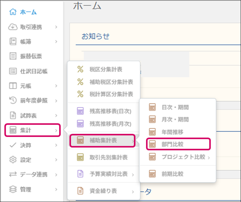 1. メニュー[集計]→[補助集計表]→[部門比較]をクリックします。