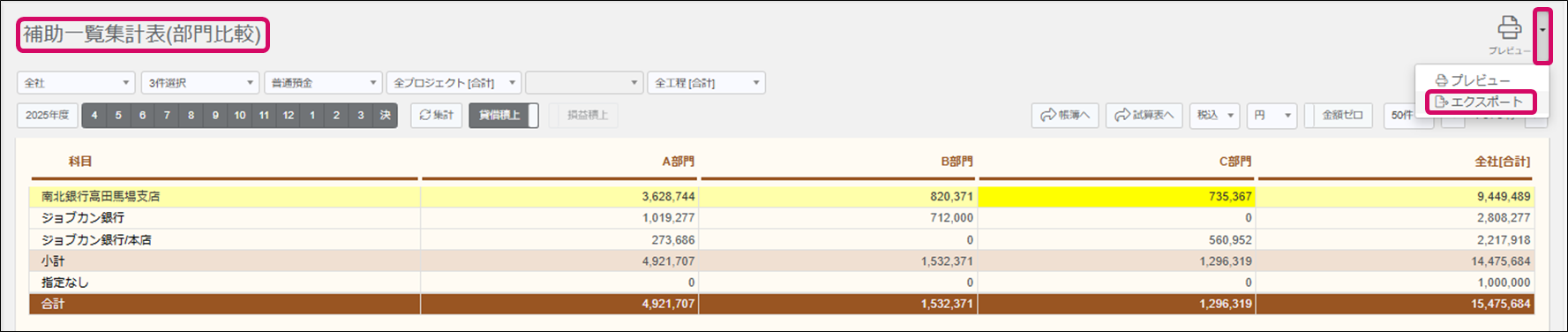 1. [補助一覧集計表(部門比較)]画面右上の[プレビュー]横の「▼」→[エクスポート]をクリックします。