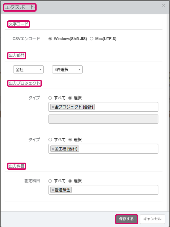 2. [エクスポート]のダイアログが表示されるので、[文字コード]、[出力部門]、[出力プロジェクト]、[出力科目]を選択して、画面右下の[保存する]をクリックします。