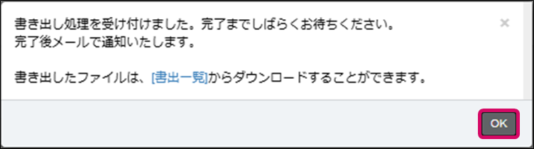 3. 書き出し処理受付のダイアログが表示されるので、画面右下の[OK]をクリックして完了です。