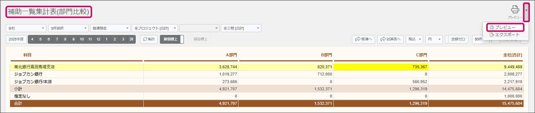 1. [補助一覧集計表(部門比較)]画面右上の[プレビュー]または横の[▼]→[プレビュー]をクリックします。