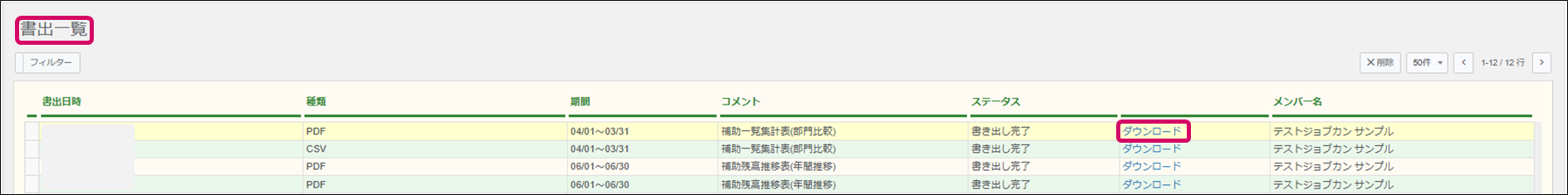 5. [データ連携]→[書出一覧]をクリックし、該当データ行にある [ダウンロード] をクリックしてください。