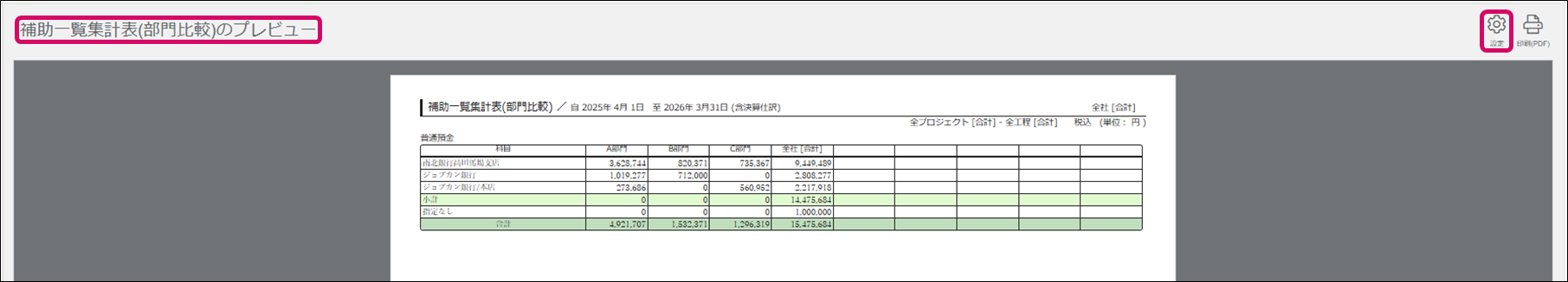 2. [補助一覧集計表(部門比較)のプレビュー]画面右上の[設定]をクリックします。