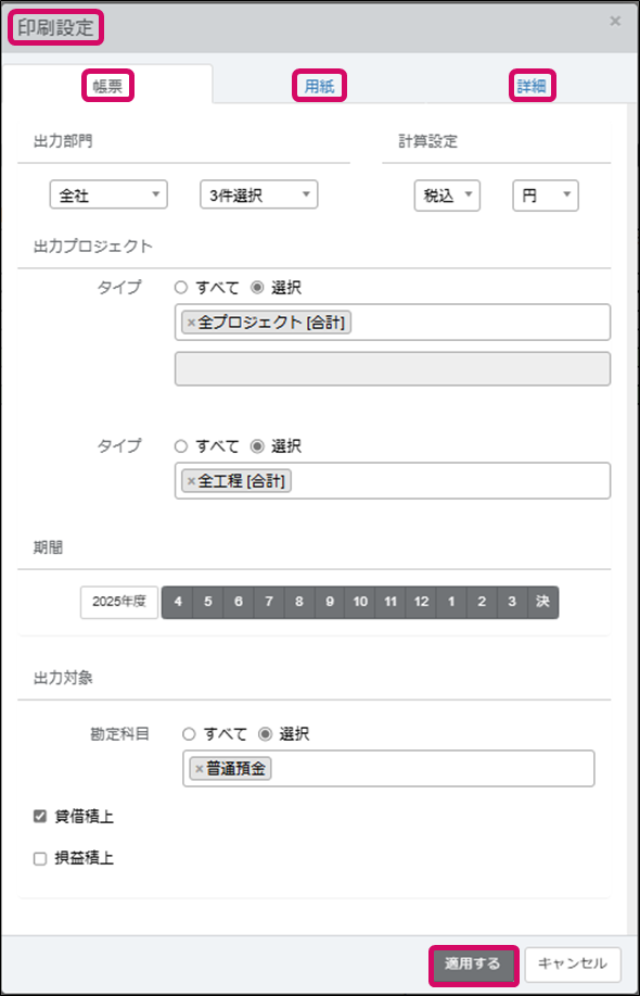 3. [印刷設定]が表示されるので、必要に応じて[用紙]の設定を行い、画面右下の[適用する]をクリックします。