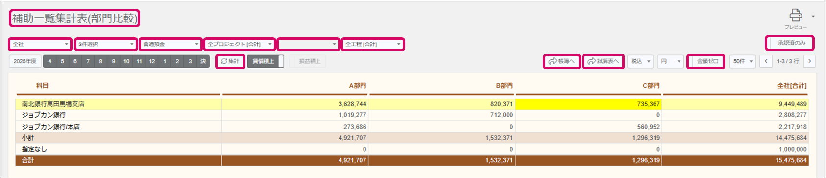 補助一覧集計表(部門比較)では、各部門の補助科目ごとに合計額と残高を、指定した月度や期間で表示します。