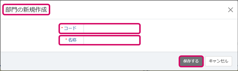 3. [部門の新規作成]ダイアログが表示されます。[コード]と[名称]をそれぞれ入力し、[保存する]をクリックします。