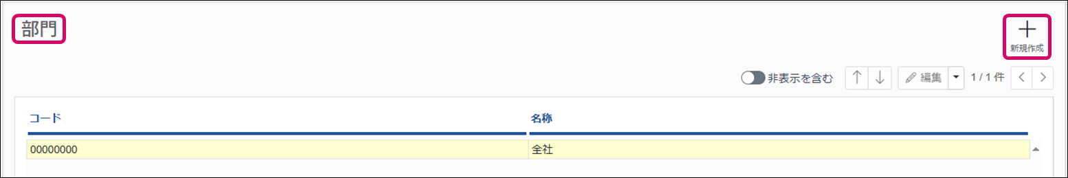 2. [部門]画面が表示されます。画面右上の[新規作成]をクリックします。