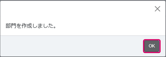 4. [部門を作成しました]のメッセージが表示されるので、[OK]をクリックします。