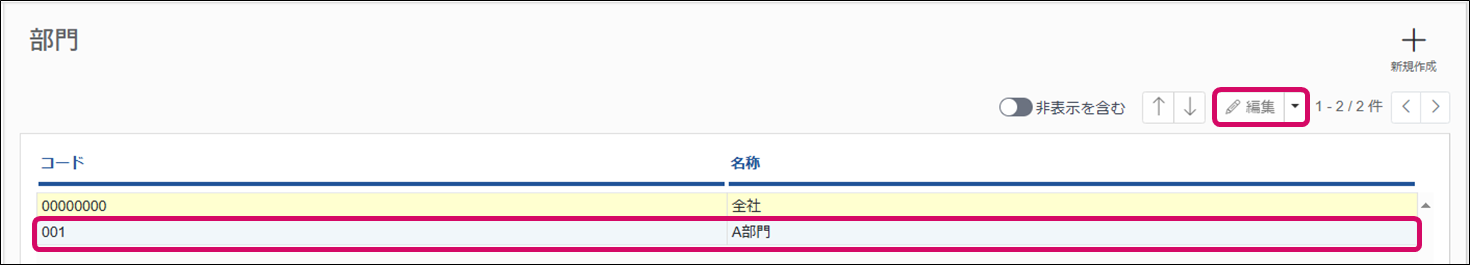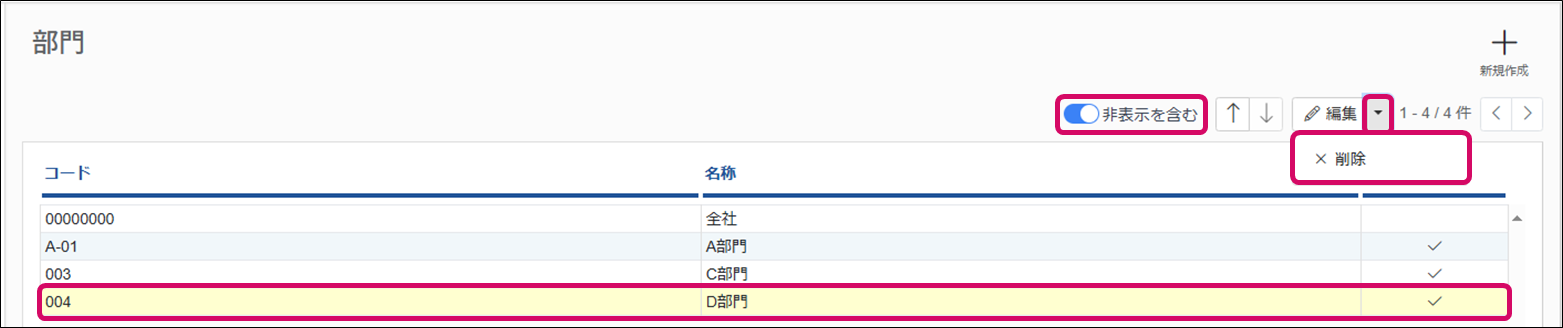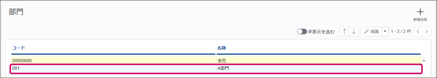 ※[非表示を含む]をクリックすると、非表示の部門を確認できます。