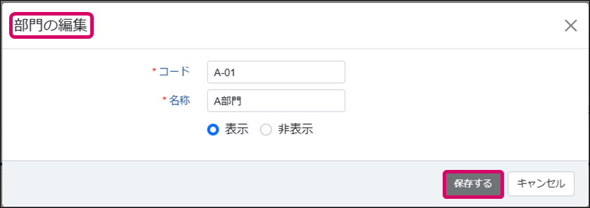 3. [部門の編集]ダイアログが表示されます。部門内容を編集し、[保存する]をクリックします。