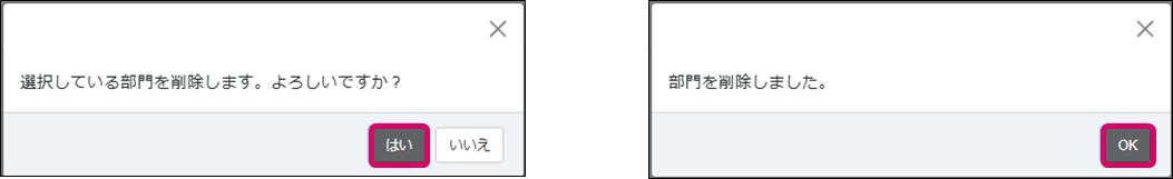 6. 「選択している部門を削除します。」が表示されます。[はい]をクリックすると「部門を削除しました。」が表示されるので[OK]をクリックします。