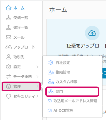 1. メニュー[管理]→[部門]をクリックします。