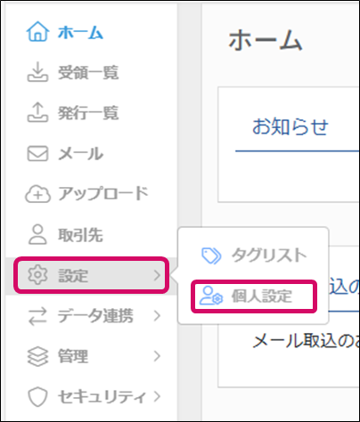 1. メニュー[設定]→[個人設定]をクリックします。