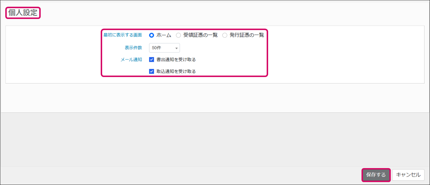 2. [個人設定]画面が表示されます。各項目を設定し、[保存する]をクリックします。