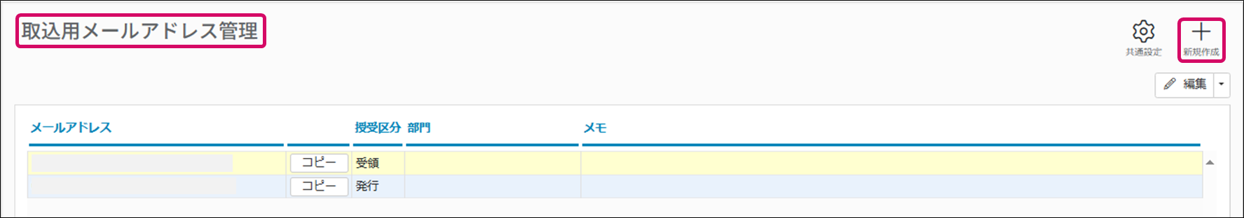 2. [取込用メールアドレス管理]画面が表示されます。画面右上の[新規作成]をクリックします。