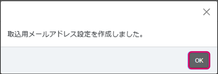 5. 「取込用メールアドレス設定を作成しました。」のメッセージが表示されるので、[OK]をクリックします。