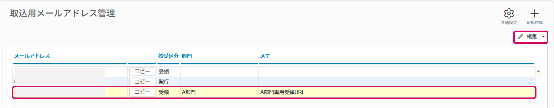 1. [取込用メールアドレス管理]画面で編集したい行をダブルクリックまたはクリック後、[編集]をクリックします。