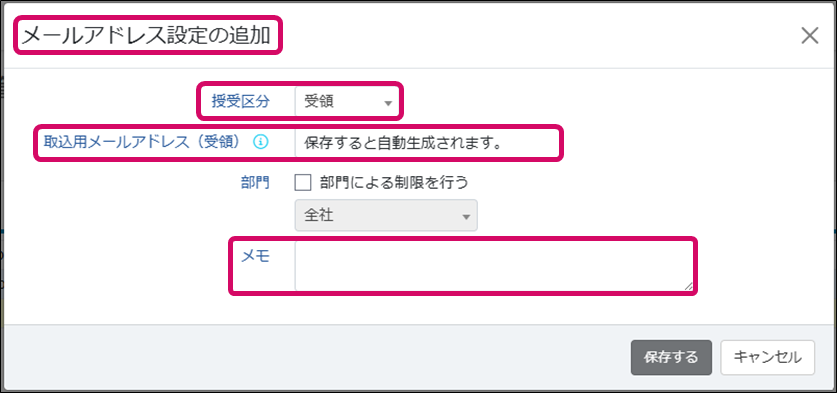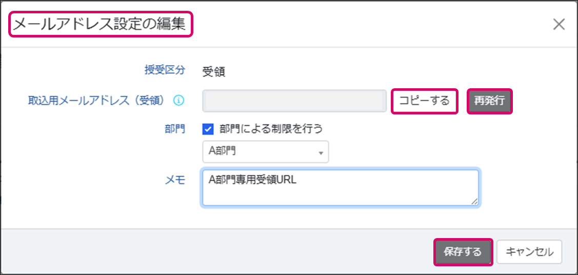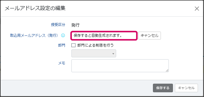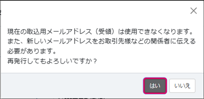 ※[保存する]ボタンをクリックすると、「現在の取込用メールアドレス~再発行してもよろしいでしょうか?」の確認が表示されるので、[はい]をクリックすると保存されます。
