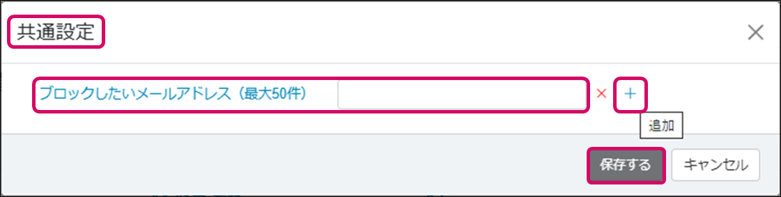 3. [共通設定]ダイアログ画面が表示されるので、[ブロックしたいメールアドレス(最大50件)]を入力し、[保存する]をクリックします。