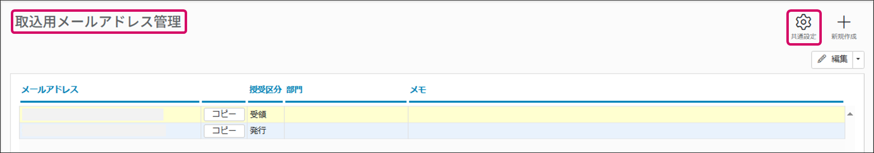 2. [取込用メールアドレス管理]画面が表示されます。画面右上の[共通設定]をクリックします。