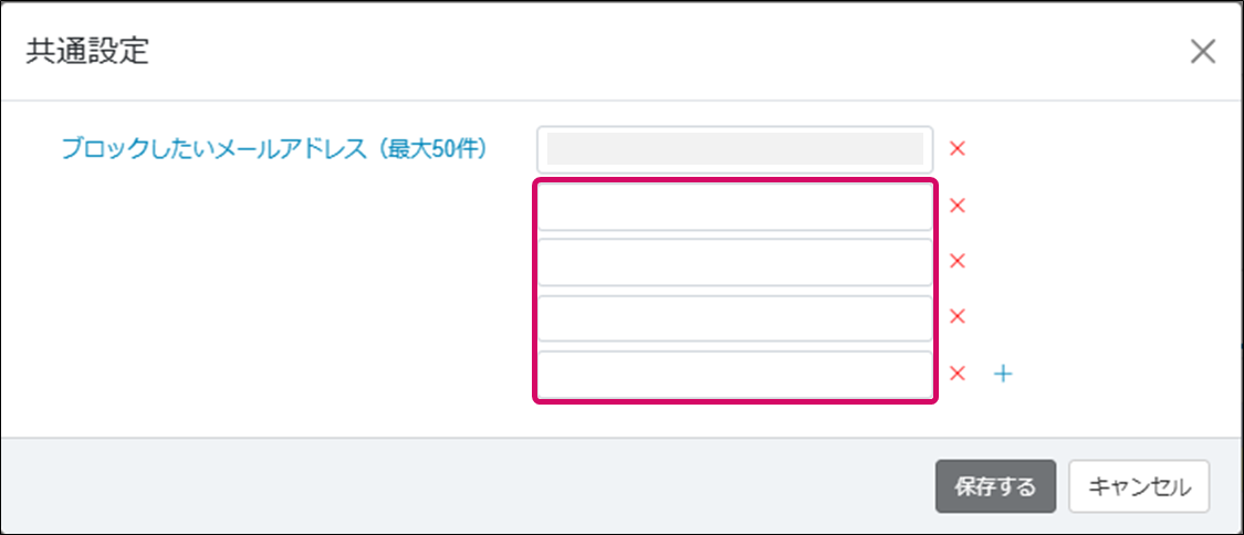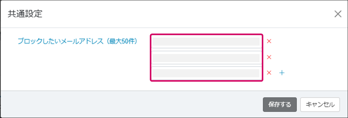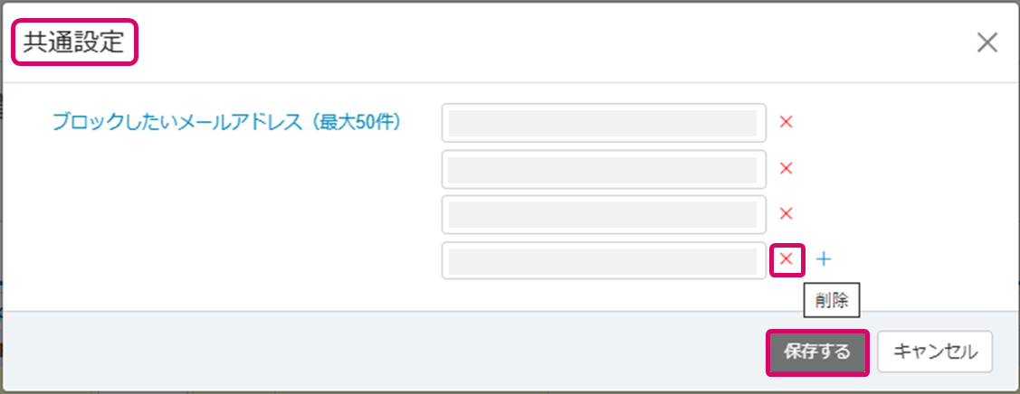6. ブロックしたメールアドレスを解除するには、[共通設定]ダイアログで解除したいメールアドレス右横の「×」ボタンをクリックし、[保存する]をクリックします。