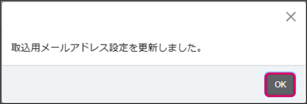 3.「取込用メールアドレス設定を更新しました。」のメッセージが表示されるので[OK]をクリックします。