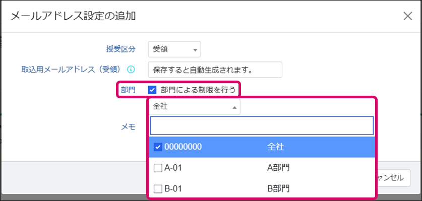 4. 部門による制限を行う場合は[部門]チェックを入れ、部門を選択し、[保存する]をクリックします。