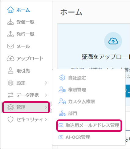 1. メニュー[管理]→[取込用メールアドレス管理]をクリックします。