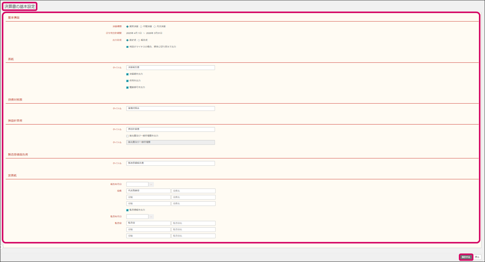 決算仕訳を作成後は決算書作成にあたり、決算書の基本設定を行います。