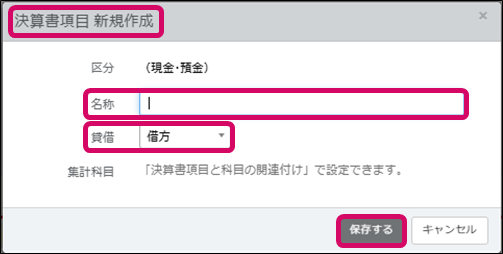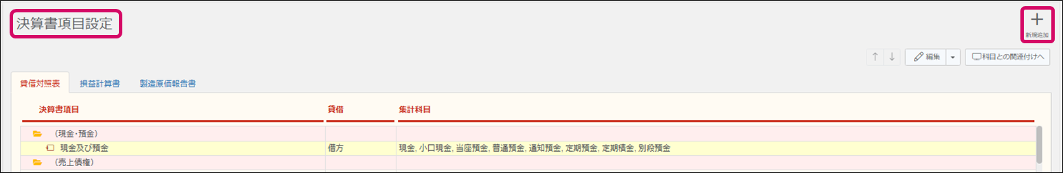 割り当てる決算書項目が無い場合は、新たに決算書項目を追加します。